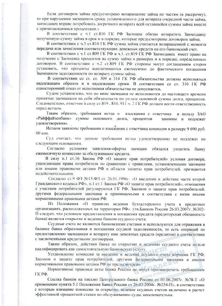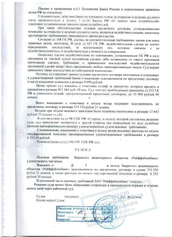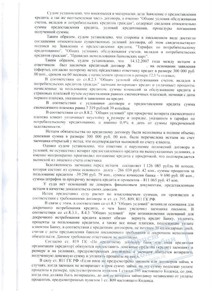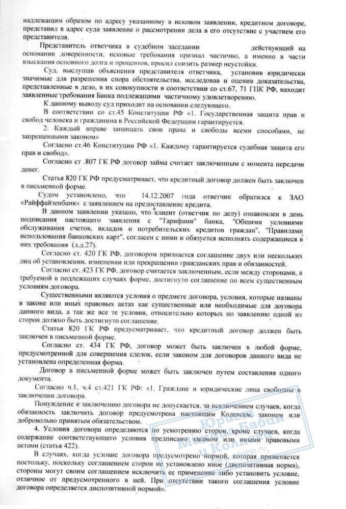 В нашу компанию обратился Д.Г., который пояснил, что ЗАО "Райффайзенбанк" подал на него в суд из-за неисполнения обязательств по кредитному договору. Наш клиент взял у банка в кредит 300.000 рублей под 12,5% годовых. 300.000 рублей были перечислены на расчетный счет, но, после временной невозможности выплачивать долг по кредиту вовремя, банк насчитал пени, увеличивающие сумму долга до 1 126 085 рублей.