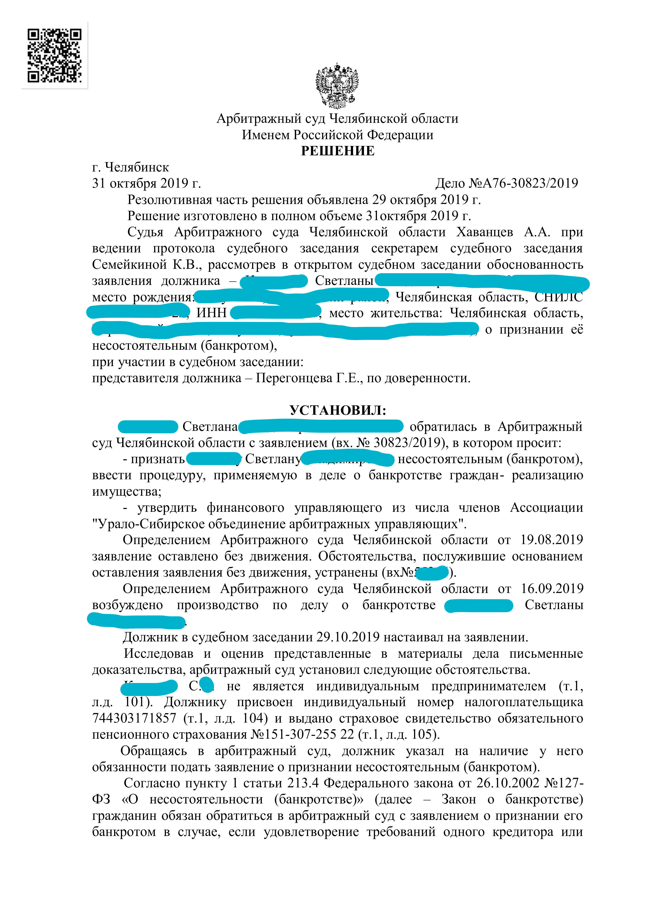 Арбитражный суд Челябинской области вынес решение признать Светлану несостоятельным (банкротом), что ведет за собой полное списание ее долгов.