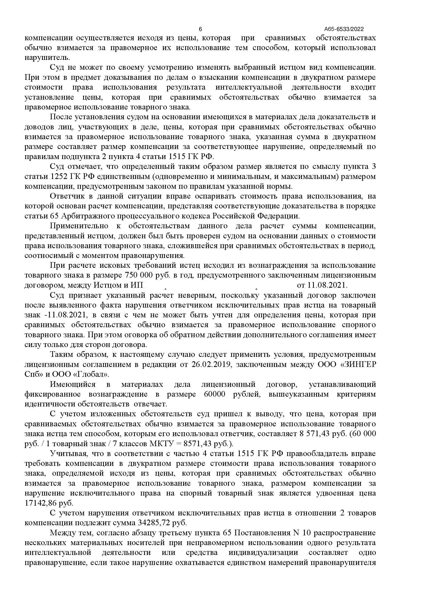 Истец требовал компенсацию за продажу двух маникюрных инструментов, основывая свой расчет на лицензионном договоре, заключенном после даты нарушения. Юристам «Оригинального решения» удалось доказать, что данный договор не может быть применен к рассматриваемому случаю, а также объединить две покупки в одно нарушение, что привело к более чем 20-кратному снижению размера компенсации.