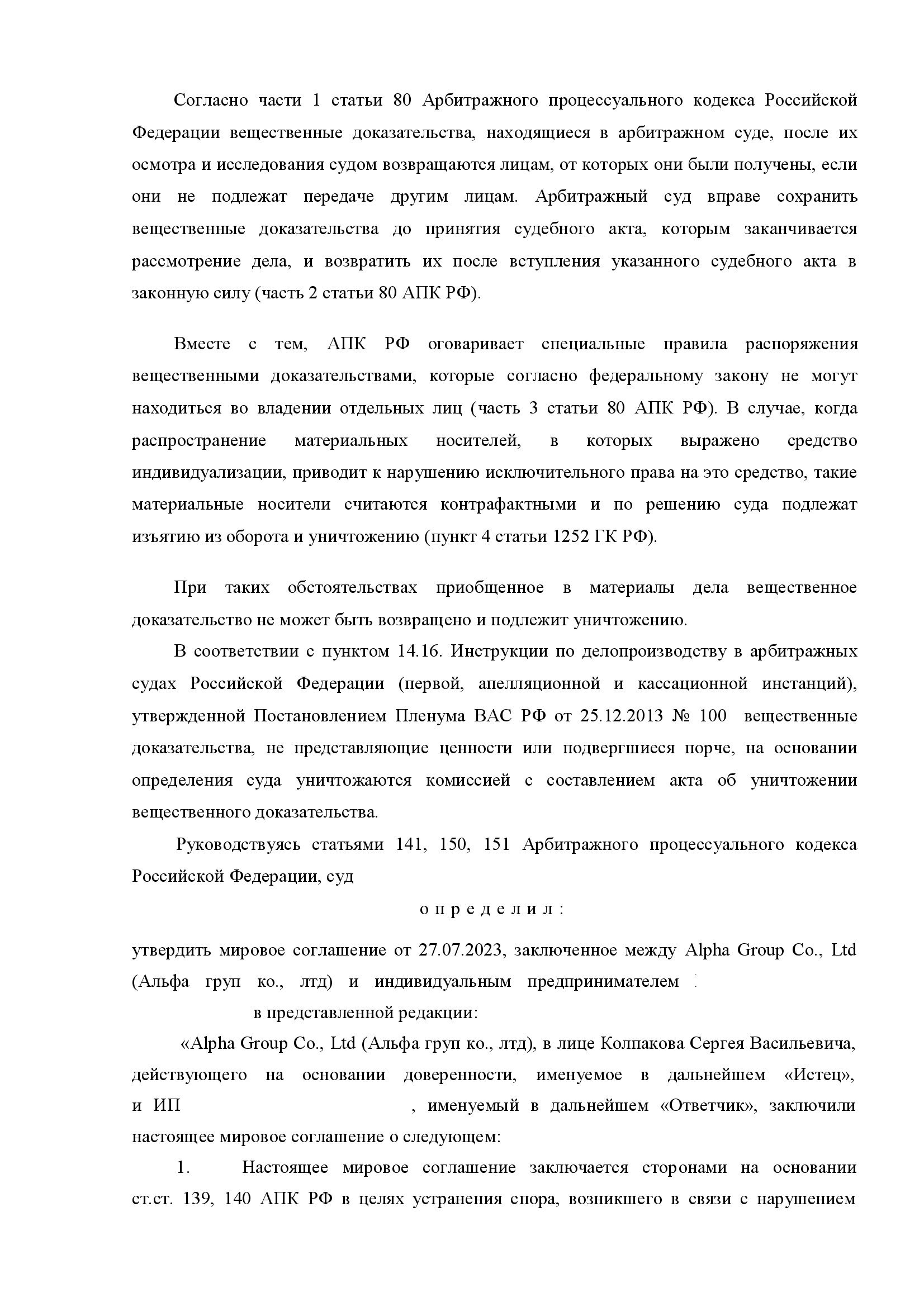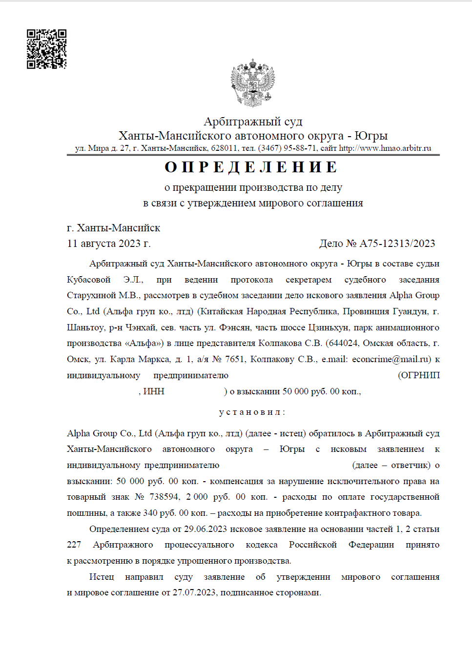 Мировое соглашение с Alpha Group: снижение компенсации за товарный знак с 50 000 до 10 000 рублей