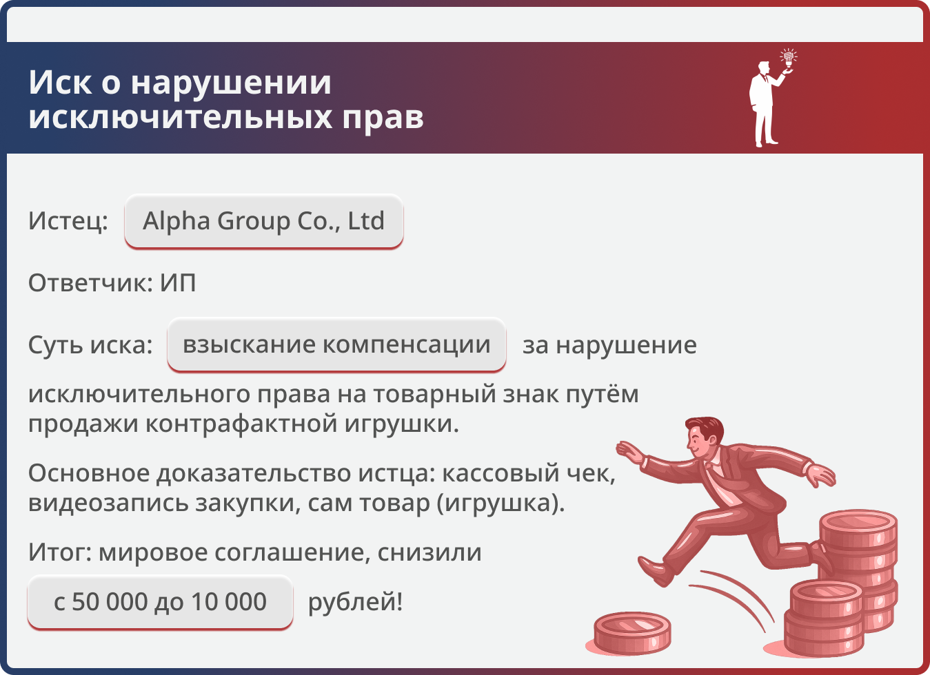 Первоначально истец требовал 50 000 руб. компенсации за нарушение прав на товарный знак. Перед защитой стояла задача минимизировать финансовые потери доверителя и добиться подписания мирового соглашения на максимально выгодных для ответчика условиях.