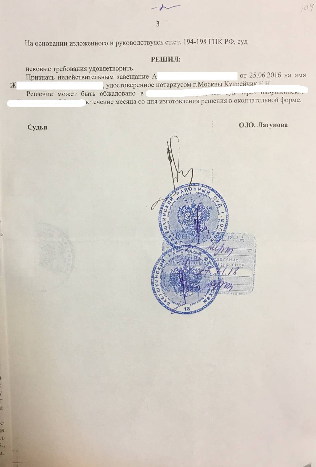 Ссылаясь на все материалы дела, суд вынес решение об удовлетворении требований истицы и признании завещания от 25.06.2016 недействительным.