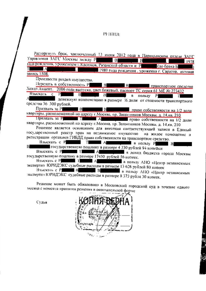 Клиент обратился к адвокату для расторжения брака и раздела совместно нажитого с супругой имущества. Прежде всего клиенту было необходимо признать право собственности на 1/2 доли в праве собственности на квартиру и оставить себе автомобиль с выплатой половины его стоимости в пользу супруги.