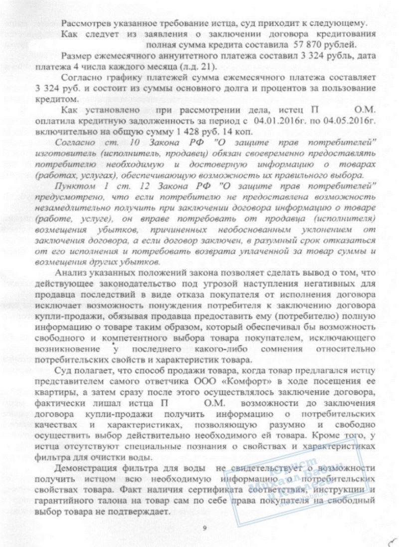 Пенсионерка П.О.М. впустила в дом распространителя приборов для очистки воды, чтобы тот провел презентацию своей продукции. Под давлением его аргументов и настойчивости, П.О.М. заключила договор на установку немецких водяных фильтров на сумму почти 90 000 рублей. Она отдала 10 000, которые нашлись дома, а на оставшуюся сумму ей был тут же оформлен "беспроцентный" кредит.