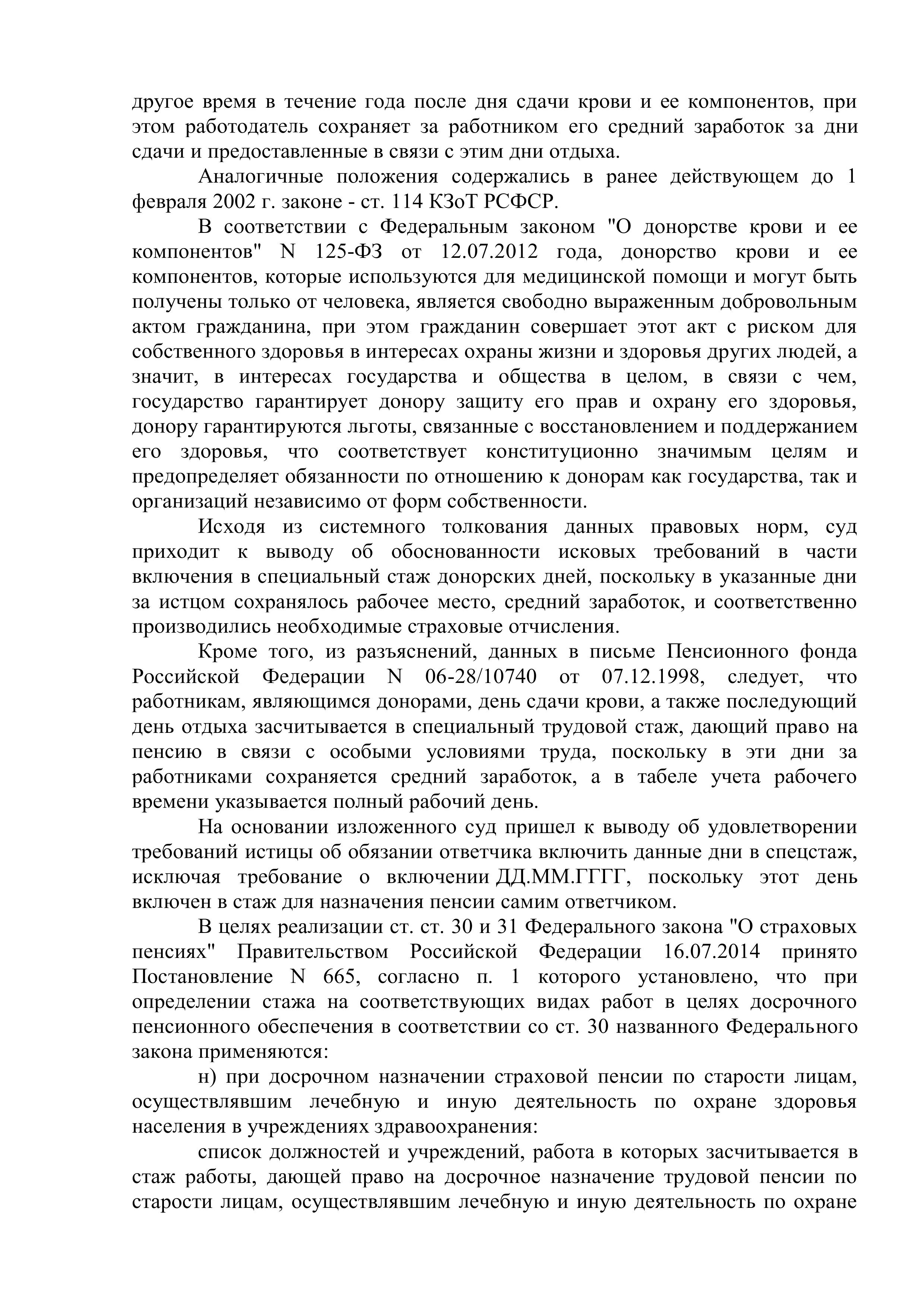 Юрист "Оригинального решения" подготовил все необходимые документы, доказывающие суду то, что УПФР незаконно не включил в специальный стаж для назначения досрочной пенсии периоды работы, в сумме составляющие более 26 месяцев. Также, благодаря проделанной работе, удалось убедить суд включить в специальный стаж дни отдыха, после сдачи донорской крови.