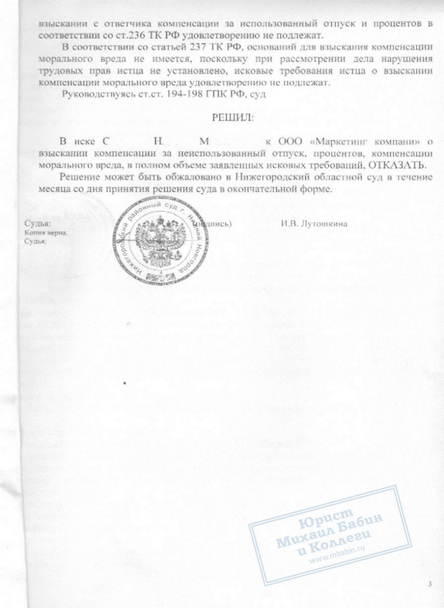 С.Н. обратилась в суд на ООО "МК" с требованием компенсации за неиспользованный отпуск и компенсации морального вреда. Юрист, специализирующаяся на трудовых взаимоотношениях, выступала в суде на стороне работодателя. На судебном заседании ей удалось доказать, что требования С.Н. безосновательны, так как все причитающиеся ей выплаты были произведены при увольнении в полном объеме.