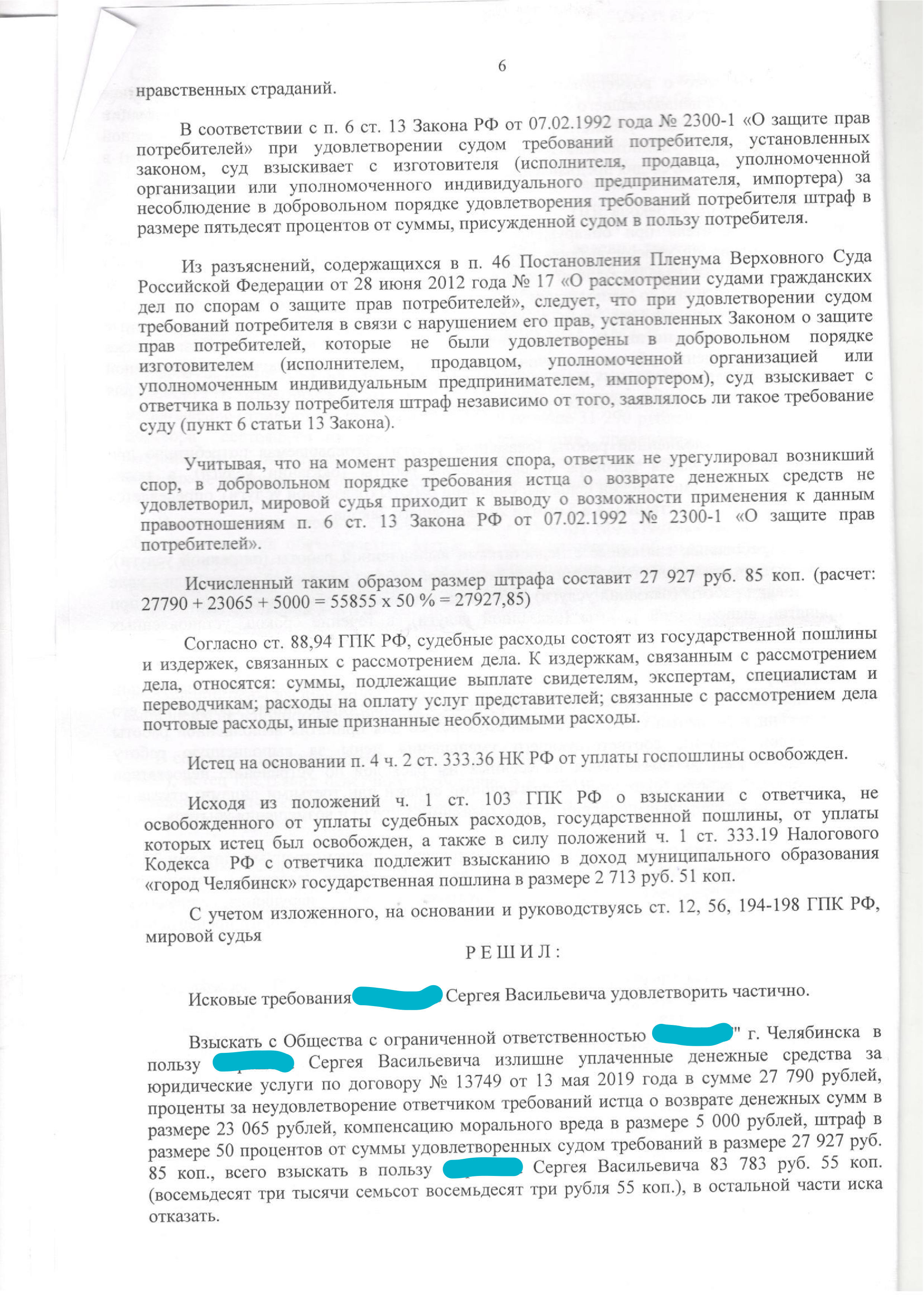 После успешно проделанной работы нашими юристами удалось взыскать в пользу нашего клиента уплаченные денежные средства, а также проценты и компенсацию морального вреда, общая сумма взыскания cоставляет 83 783 руб. 55 коп.