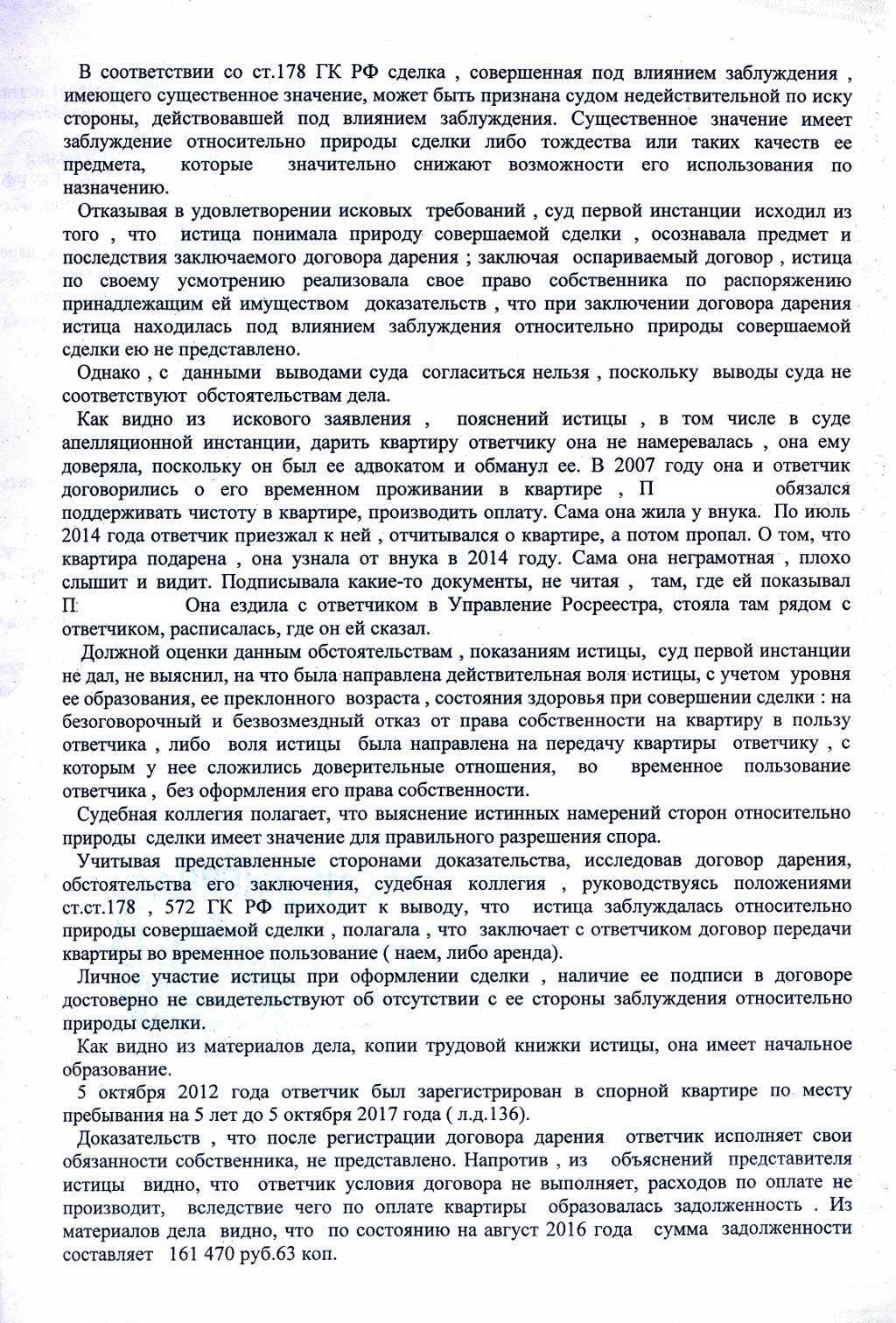 4 октября 2016 в Судебной коллегии по гражданским делам было заслушано дело по апелляционной жалобе на решение районного суда. В инстанцию обратилась истица, 1924 года рождения, с иском о признании недействительным договор дарения однокомнатной квартиры. В принятом судебном решении говорилось об отказе в удовлетворении исковых требований.