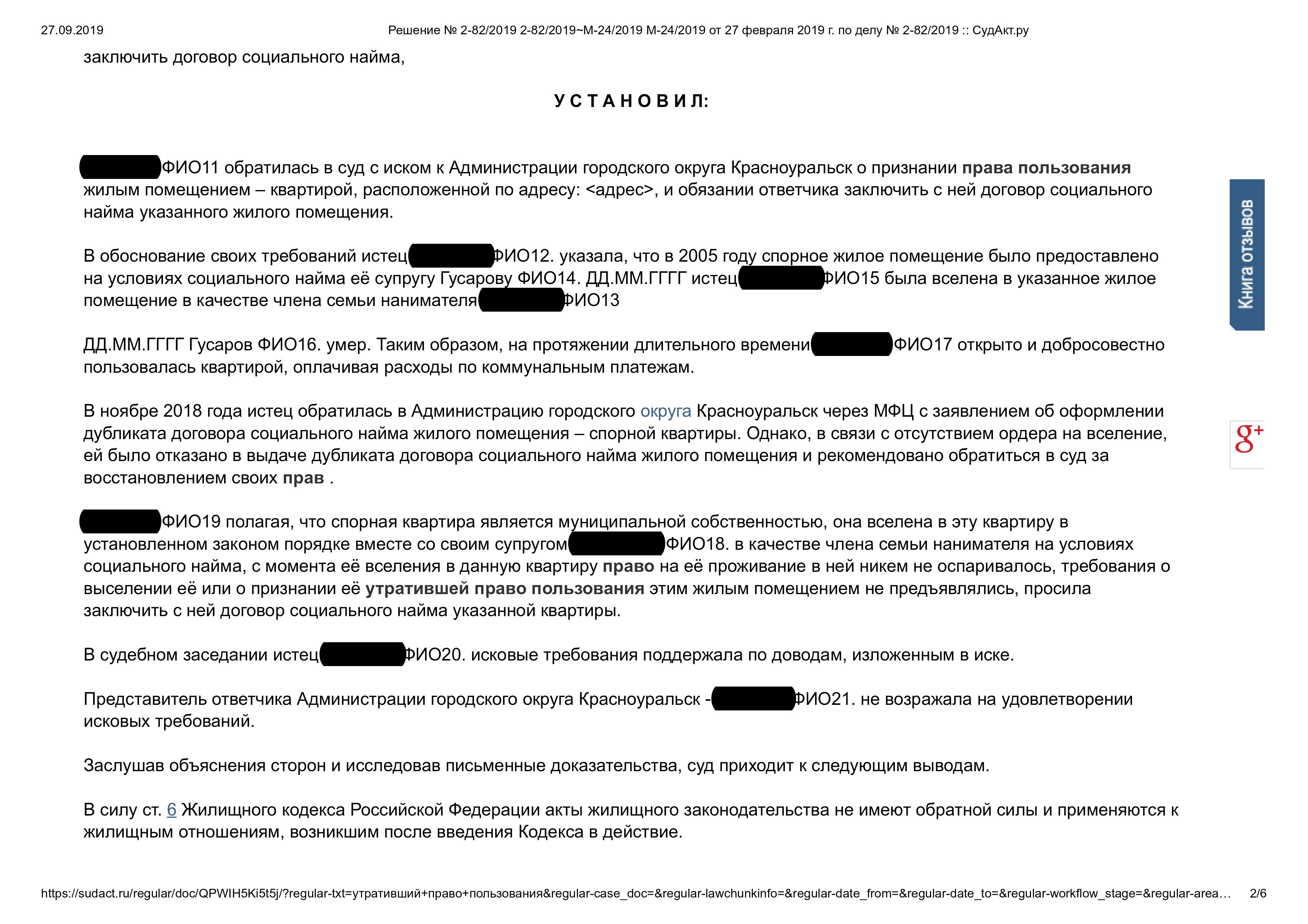Суд решил: Признать за истцом право пользования жилым помещением – квартирой на условиях договора социального найма. Обязать Администрацию городского округа Красноуральск заключить договор социального найма с истцом на жилое помещение – квартиру.